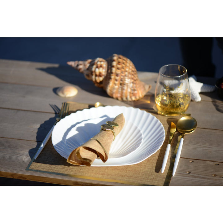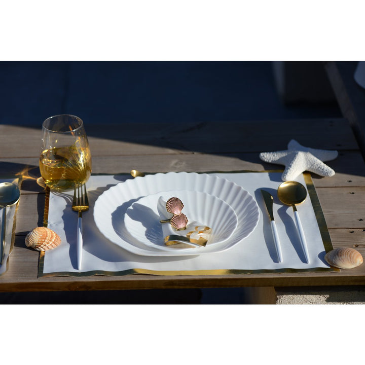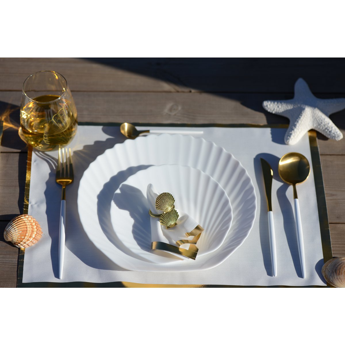 24-delig wit en goud bestekset, 6 messen, 6 vorken, 6 lepels, 6 dessertlepels Aulica is een Frans merk gespecialiseerd in serviesgoed VAATWASSERBESTENDIG: Nee VOEDSELVEILIG: Ja MAGNETRONBESTENDIG: Nee OVENBESTENDIG Nee