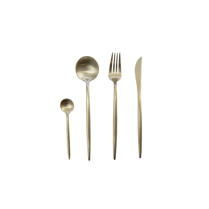 Bestekset 24 delig in champagnekleur, vaatwasmachinebestendig, 6 messen, 6 vorken, 6 lepels, 6 dessertlepels Aulica is een Frans merk gespecialiseerd in serviesgoed VAATWASSERBESTENDIG: Ja VOEDSELVEILIG: Ja MAGNETRONBESTENDIG: Nee OVENBESTENDIG Nee.