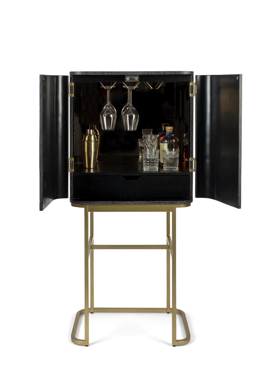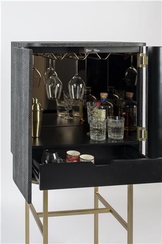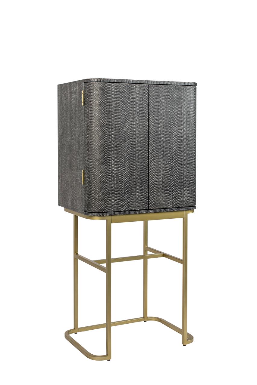 De kast is geïnspireerd op de ‘Art Deco’ tijd. De kast is bekleed met slangenprint en de poten hebben een messing laagje. De twee deuren van de kast duw je open, om daarachter drie rekken voor je wijnglazen te ontdekken. Ook zit er een handige uittrekbare lade in. En als kers op de Art Deco taart: de achterkant bestaat uit een spiegel! Naast de slangenprint, is de Ava Morgana-kast ook verkrijgbaar in Fluweel en Krokodillenhuid.