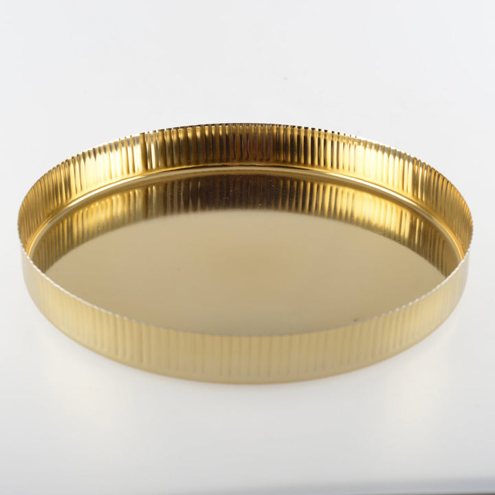 Gouden rond dienblad, met geribbeld patroon Aulica is een Frans merk gespecialiseerd in serviesgoed VAATWASMACHINEBESTENDIG: Nee VOEDSELVEILIG: Ja MAGNETRONBESTENDIG: Nee OVENBESTENDIG Nee