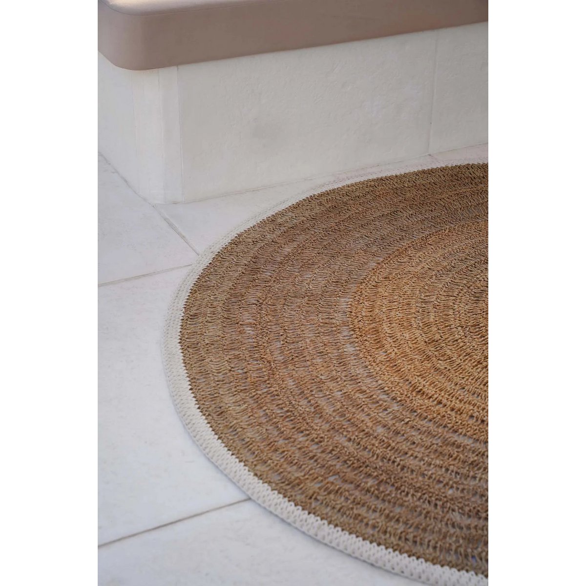 Ons circulaire zeegras & katoenen tapijt is een absolute must voor in huis. Het geeft textuur en zachtheid aan een harde vloer, waardoor een visueel accent ontstaat met de witte katoenen rand. Het is van nature slijtvast en ideaal voor uw keuken, woonruimte of overdekt terras.