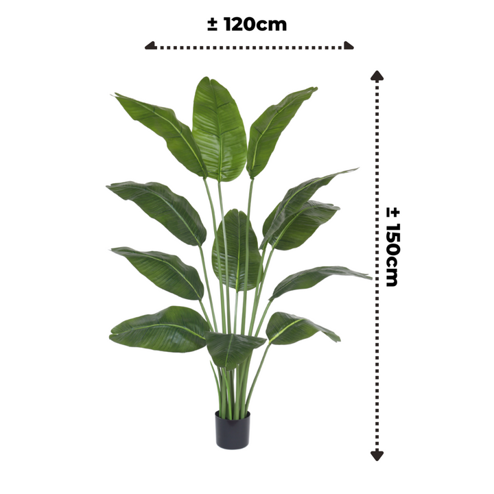 Voordelen van een kunst Bananenplant Serie A ✅ Onze kunstplanten gaan nooit dood✅ Onze kunstplanten zijn hypoallergeen✅ Onze kunstplanten vorm je eenvoudig naar wens✅ Onze kunstplanten blijven altijd de gewenste afmeting✅ Onze kunstplanten hebben geen verzorging nodig en kunnen overal staan Afmetingen kunst Bananenplant Serie A Hoogte kunstplant: 150cmDiameter kunstplant: 120cmHoogte pot: 13cmDiameter pot: 15cm Deze kunst bananenplant is een echte topper om jouw kamer, kantoor of winkel om te toveren in een onderhoudsvriendelijke urban jungle. Deze tropische topper heeft 12 mooie grote groene bladeren en maakt de ruimte erg sfeervol en gezellig! Een echte bananenplant heeft erg veel zon en water nodig, maar deze plant is al tevreden met een goede stofbeurt op z’n tijd. Bloempotje erbij? Deze Bananen kunstplant wordt standaard geleverd met een zwarte “kweekpot”. Op zoek naar een mooiere partner voor je Bananen kunstplant? Bekijk dan hier al onze bloempottenOp zoek naar één van mijn Banana brothers? Die vind je hier