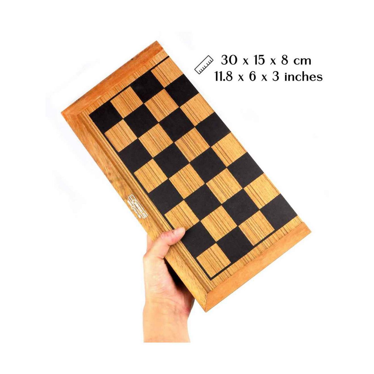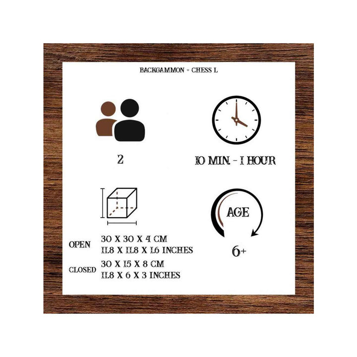 1 - BACKGAMMON: SPEL: Elke speler heeft 15 pionnen die hij langs 24 driehoeken (punten) beweegt, met 2 dobbelstenen DOEL: wees de eerste om al je schijven van het bord te verwijderen, probeer je tegenstander te blokkeren en zijn belemmerende acties te vermijden 2 - SCHAKEN: UITDAGING: de eerste speler die de koning van de tegenstander schaakmat zet, wint Houten pionnen, handgemaakte uitsparing. Een prachtige uitvoering in massief hout, perfect voor thuis en onderweg dankzij de hersluitbare doos. Afmetingen van het open veld: 30 x 30 x 4 cm Afmetingen gesloten spel: 30 x 15 x 8 cm Gewicht: 1kg