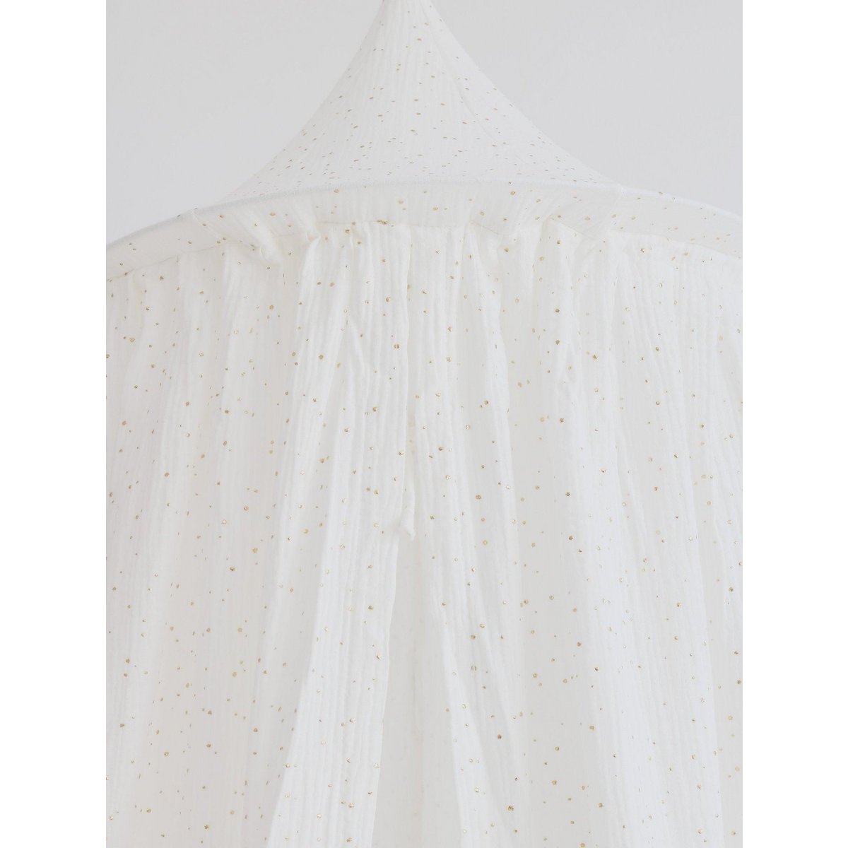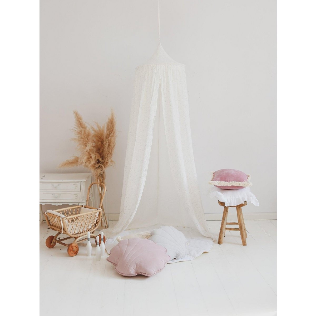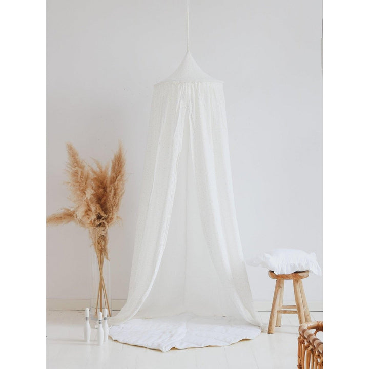 Comfortabel, casual, relaxed. Uitputtende expedities en missies kunnen niet eeuwig duren. Voor rustiger spelen en ontspannen is een klein, gezellig hoekje nodig. Ook het vertellen van verhalen heeft focus en rust nodig. Gebruik hem als interieurdecoratie, als overkapping, draagbaar of permanent – de overkapping werkt in veel situaties, ook voor het ophangen van slingers of speelgoed, of zelfs als klamboe op je terras! ONDERDEEL VAN DE BOHO STYLE COLLECTIE Boho is een artistieke bohemien stijl, geleid door comfort, zomer en vrijheid. Je vindt hier en daar wat etnische verwijzingen, een aantal bloemen waar mogelijk, en natuurlijkheid – een knipoog naar Moeder Natuur. Combineer de overkapping met kussens, matten en slingers! Eenvoudig en natuurlijk van vorm, deze luifel is robuust, gemaakt van crèmekleurige katoenen stof met gouden stippen. Dankzij de handige bandjes is hij gemakkelijk af te doen en te wassen. Er zitten ook katoenen riemen aan de binnenkant van de overkapping waarmee je een extra ornament of lamp kunt ophangen. Katoenen stof, rand Stof: 100% OEKO-TEX®-katoen. Wastemperatuur: tot 30°C. Diameter rand: 50 cm. Lengte luifel: 240 cm plus riemen.
