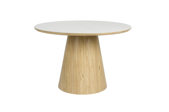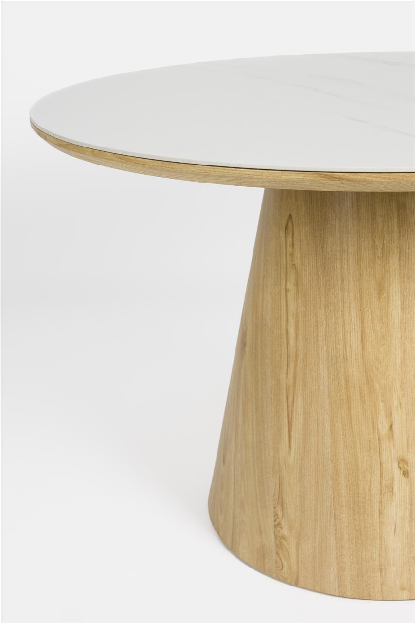 Stijlvolle ronde eettafel in eiken en walnoot houtlook. Het mat witte marmerlook blad voegt een frisse touch toe aan je interieur, perfect voor gezellige diners met vrienden en familie.