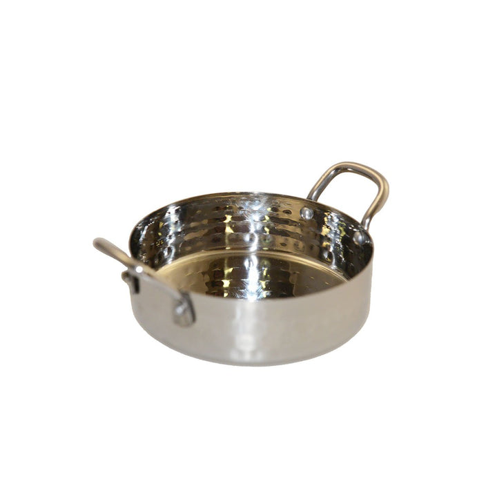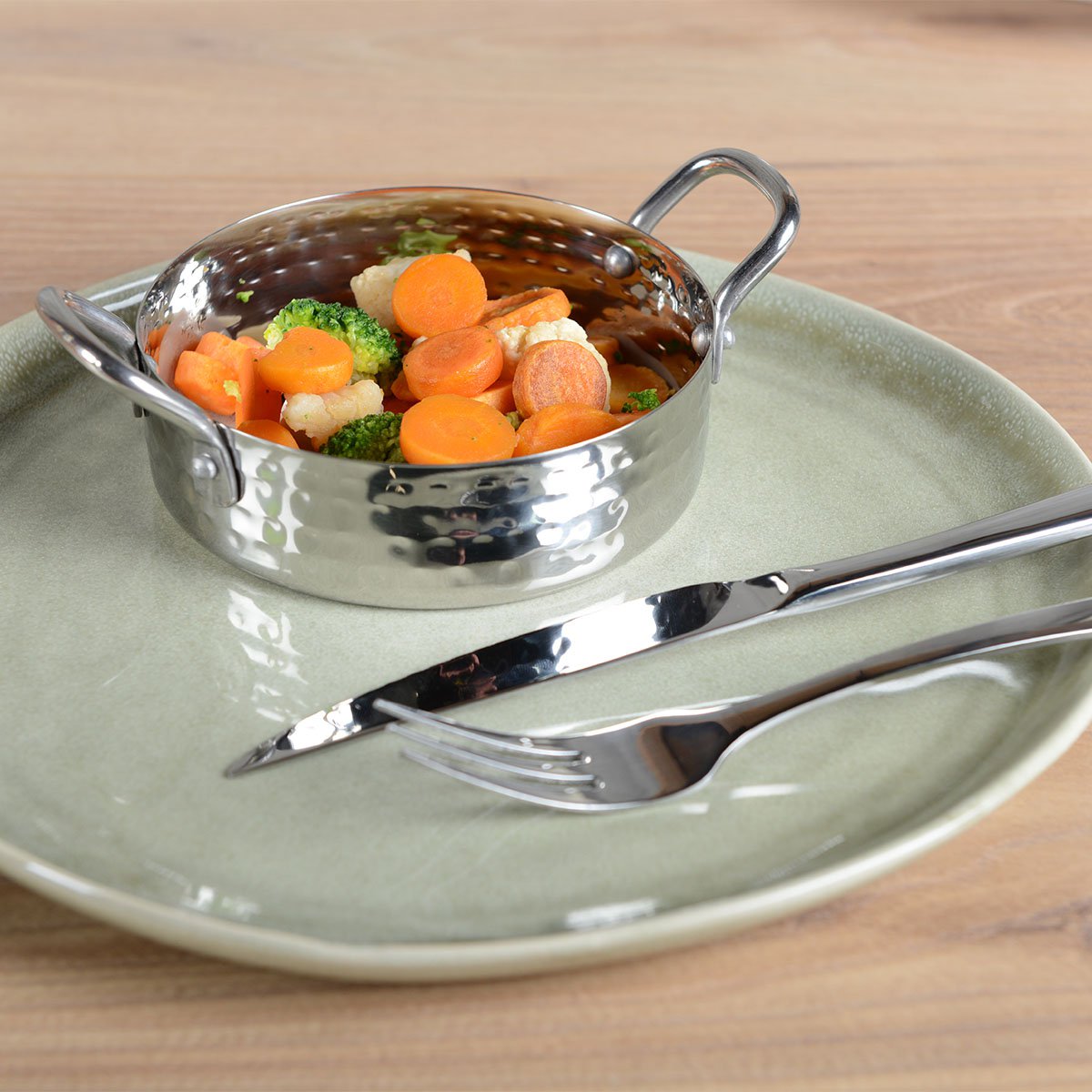 Mini gehamerde steelpan, rond met twee handvatten Aulica is een Frans merk gespecialiseerd in serviesgoed VAATWASMACHINEBESTENDIG: Ja VOEDSELVEILIG: Ja MAGNETRONBESTENDIG: Nee OVENBESTENDIG Ja