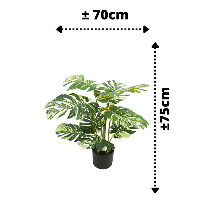 Voordelen van een Monstera Kunstplant 75cm ✅ Onze kunstplanten gaan nooit dood✅ Onze kunstplanten zijn hypoallergeen✅ Onze kunstplanten vorm je eenvoudig naar wens✅ Onze kunstplanten blijven altijd de gewenste afmeting✅ Onze kunstplanten hebben geen verzorging nodig en kunnen overal staan Afmetingen Monstera Kunstplant 75cm Hoogte kunstplant: 75cmDiameter kunstplant: 65cmHoogte pot: 12,5cmDiameter pot: 15cm De Monstera is op zijn heerlijke rijpe zoete vrucht na behoorlijk giftig, maar daar hoef je met deze Monstera niet bang voor te zijn! Met zijn 75 centimeter heeft hij een mooie lengte en groter wordt 'ie toch niet. Of had je nog niet gezien dat het een kunstplant was? Bloempotje erbij? Deze Monstera kunstplant wordt standaard geleverd met een zwarte “kweekpot”. Op zoek naar een mooie partner voor je kunst Monstera?Bekijk dan hier al onze bloempotten