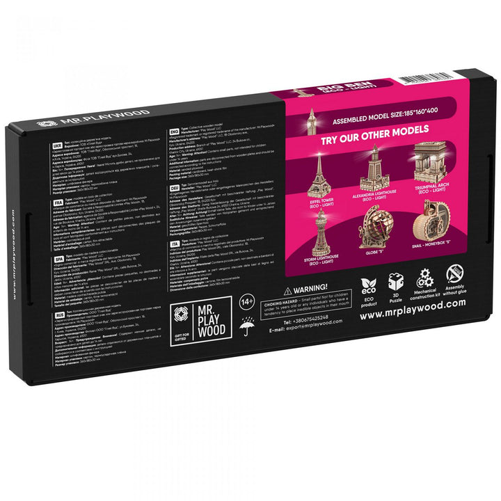 Mr. Playwood 3D Houten Puzzel, Big Ben met LED verlichting, 10206, 18,5x16x40cm