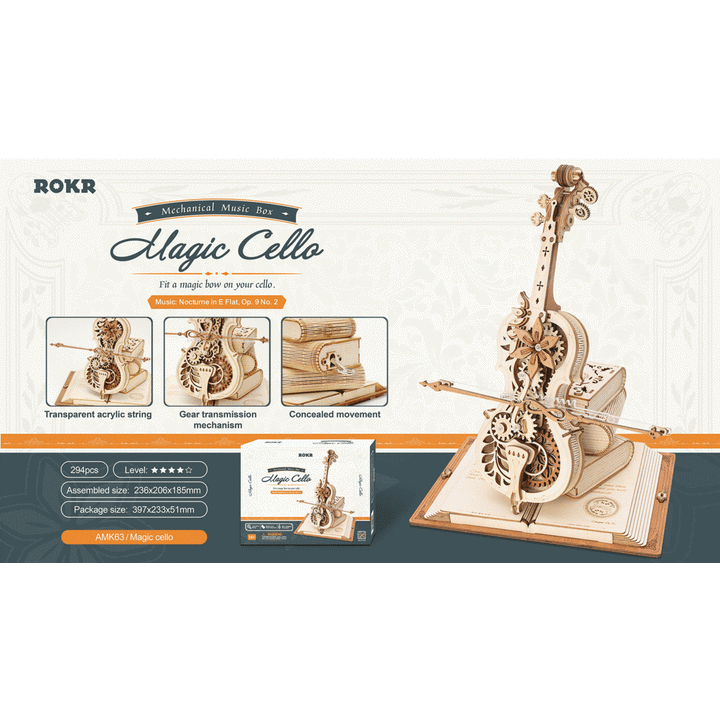 Muziekdoos Hout DIY 3D Puzzel Magic Cello, Robotime, AMK63, 23,5x20,5x18,5cm