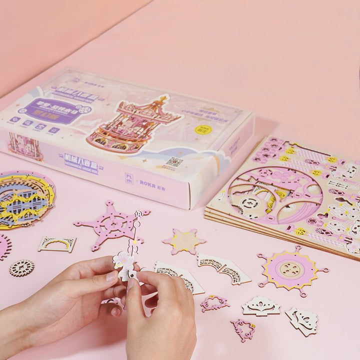 Muziekdoos Hout DIY 3D Puzzel Romantic Carousel Dream Version met LED, Robotime, AMK62J, 23,5x17x17cm