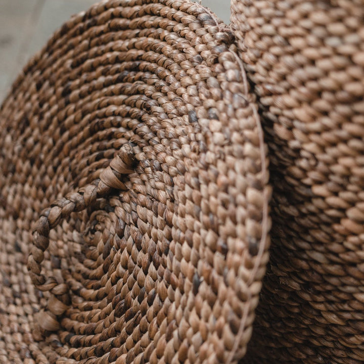 De waterhyacint is een tropische waterplant die groeit op rivieren en meren. Het komt eigenlijk uit Zuid-Amerika, maar werd ook geïntroduceerd in Zuidoost-Azië. Daar wordt het als een onkruid beschouwd omdat het zich ongelooflijk snel vermenigvuldigt en hele watermassa's kan bedekken met een tapijt van bladeren. Het daaruit voortvloeiende gebrek aan licht en zuurstof zorgt ervoor dat al het leven onder water afsterft. Daarom moeten de planten regelmatig worden verwijderd. Om de planten klaar te maken voor verdere verwerking worden de bladeren afgesneden en worden de dikke stengels drie tot zeven dagen in de zon gedroogd. Het resultaat is een overvloedige, duurzame grondstof voor veel vlechtwerk hier bij Soeji!