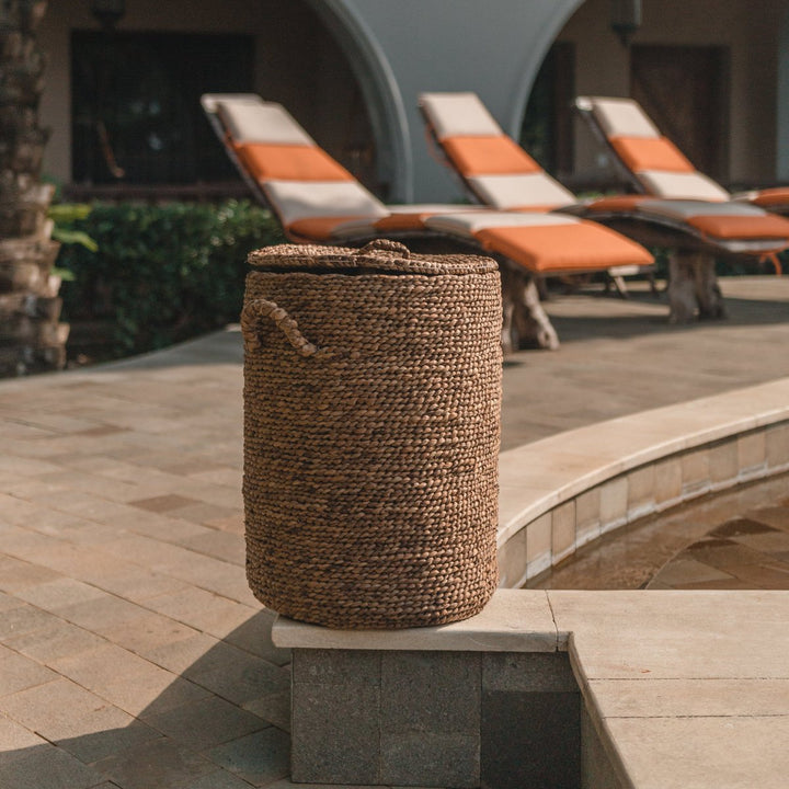 De handgeweven Ikatmand van dikke, zware waterhyacint is met zijn praktische deksel en twee bevestigde handvatten de perfecte organizer voor je badkamer of slaapkamer.