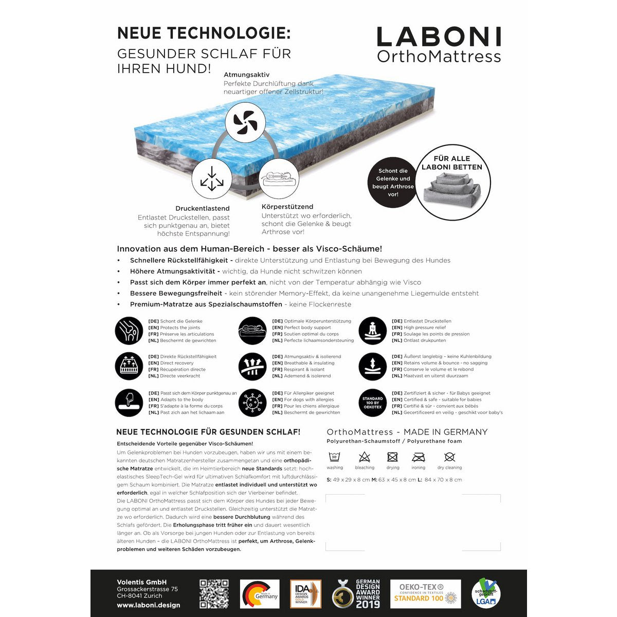ORTHO hondenbed - GLAM Orthopedisch hondenbed van fijn fluweel - knuffelzacht, robuust en gemakkelijk te onderhouden dankzij het lotuseffect! Het fluweelzachte GLAM hondenbed staat met zijn matte glans en licht gestructureerd oppervlak voor eenvoudige elegantie. Het elegante kleurenspel maakt GLAM tot een glamoureuze blikvanger, omdat het materiaal afhankelijk van de lichtinval lichter of donkerder lijkt. De elegante bies maakt het ontwerp compleet. Dankzij een speciale productietechniek is het luxe bekledingsmateriaal zeer zacht en strak geweven. De innovatieve OrthoMattress van speciaal schuim garandeert een gezond slaapcomfort en biedt vele voordelen ten opzichte van conventionele orthopedische matrassen van viscoschuim: Sneller herstel - directe ondersteuning en verlichting bij beweging van de hond Hoger ademend vermogen - belangrijk omdat honden niet kunnen zweten Past zich altijd perfect aan het lichaam aan, niet afhankelijk van de temperatuur zoals Visco Betere bewegingsvrijheid - geen hinderlijk memory-effect, want er is geen onaangenaam ligvlak Premium matras van speciaal schuim - geen schilferresten GLAM is daarom een perfect knuffelbed voor elke viervoeter, dat is tegelijkertijd zeer robuust en dankzij de speciale vlekbeschermingsfunctie bovendien uiterst onderhoudsvriendelijk. De zorgvuldig geselecteerde materialen zijn perfect afgestemd op de behoeften van uw viervoeter en zijn zelfs geschikt voor mensen met een allergie. De hoes kan eenvoudig worden verwijderd door middel van een interne ritssluiting en kan, net als de vulling, in de wasmachine worden gewassen. De LABONI OrthoMattress biedt gezond slaapcomfort en het hoogste comfortniveau. De innovatieve matras is een doorontwikkeling van klassieke orthopedische matrassen van viscoschuim. Voor een goede nachtrust en ter voorkoming van artrose, gewrichtsproblemen en andere gezondheidsproblemen - uw hond verdient het en zal u dankbaar zijn! Gezonde slaap voor uw hond: De LABONI OrthoMattress is een innovatief orthopedisch hightech matras dat zich bij elke beweging optimaal aanpast aan het lichaam van de hond. Door de bijzondere materiaalfusie kan uw hond tijdens het slapen zijn gehele bewegingsapparaat ontspannen. Gewrichten en drukpunten worden ontlast en het lichaam wordt ondersteund daar waar het nodig is. Dit resulteert in een betere bloedcirculatie terwijl u slaapt. De herstelfase begint eerder en duurt langer. Spieren, pezen en ligamenten ontspannen en uw hond slaapt rustiger. De hoogwaardige matras is gemaakt van speciaal schuim - de bovenste blauwe laag fungeert als topper en biedt een perfecte ontlasting en is stevig verbonden met het onderste zwarte deel van comfortschuim, dat dient als ondersteunende functie en garandeert dat de matras niet kan doorzakken . Of het nu gaat om preventie bij jonge honden of om verlichting te bieden bij oudere honden - de LABONI OrthoMattress is ideaal voor het voorkomen van gewrichtsproblemen en verdere schade bij de diagnose artrose, heupgewrichtsdysplasie (HD), elleboogdysplasie (ED) of klachten veroorzaakt door slijtage van de wervelkolom (spondylose). Maar ook iedere gezonde hond waardeert het comfortabele ligcomfort. Doorslaggevende voordelen ten opzichte van klassieke orthopedische hondenbedden van viscoschuim: Sneller herstel - directe ondersteuning en verlichting bij beweging van de hond Hoger ademend vermogen - belangrijk omdat honden niet kunnen zweten Past zich altijd perfect aan het lichaam aan, niet afhankelijk van de temperatuur zoals visco Betere bewegingsvrijheid - geen hinderlijk Memory-effect, want er is geen onaangenaam ligvlak Premium matras van speciaal schuim - geen schilferresten Echt goed materiaal: de hoes van hoogwaardige meubelstof is niet alleen knuffelzacht, maar met meer dan 45.000 wasbeurten en topscores vanwege de licht- en wrijfvastheid en pilling is het ook extreem duurzaam en krasbestendig. Dankzij de vuil- en waterafstotende impregnering is het bovendien bijzonder onderhoudsvriendelijk en net als de tijk wasbaar op 30°C. Dat aan alles is gedacht bij dit exclusieve merkproduct bewijst de interne, verborgen ritssluiting, die uw vloer beschermt tegen krassen en de sluiting tegen knabbelpogingen. Voordelen Gezond ligcomfort orthopedisch - drukontlasting & lichaamsondersteuning beschermt de gewrichten & voorkomt artrose zorgt voor een betere bloedcirculatie Premium sandwichmatras van speciale schuimen - zakt niet door Maximaal welzijn Tencel® matrashoes - klimaatregulerende natuurvezel Decoratieve hoes is afneembaar, antistatisch & met Soft Touch-effect Extreem robuust & bestendig Vuil- en waterafstotend Schuurcycli: Topscore tot > 45.000 (vanaf 10.000 geschikt voor dagelijks gebruik) Wrijfvastheid & pilling: Topwaardering 5 Licht-/kleurechtheid: Topwaarderingen 4-5 ( indoor) Geteste kwaliteit Oeko-Tex® Standard 100 gecertificeerd LGA getest, geschikt voor baby's, Duits bekend