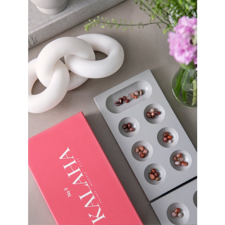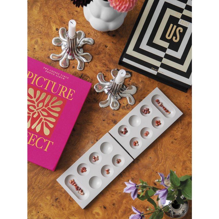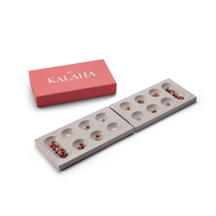 Het Zweedse merk Printworks heeft het klassieke spel Kalaha een nieuw ontwerp gegeven zodat het er niet alleen goed uit ziet tijdens het spelen maar ook kan dienen als decoratief object. Daarom kun je het spel gewoon op tafel laten liggen, waardoor je er ook sneller op terug kunt grijpen tijdens gezellige avondjes met vrienden of familie. Kalaha is een oud spel dat oorspronkelijk al dateert van 3600 jaar geleden maar heeft nu een moderne vormgeving. Het spel is gemaakt van gelakt hout en heeft een stevige constructie waardoor het compact kan worden opgevouwen. In de doos vind je ook 48 edelsteentjes en gemakkelijk leesbare instructies in het Engels, Duits en Frans.