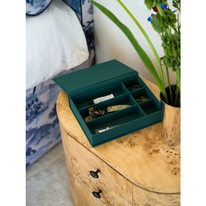Het Zweedse merk Printworks heeft een briljante oplossing bedacht om je huis georganiseerd te houden en er tegelijkertijd stijlvol en modern uit te laten zien!Deze opbergdoos is ontworpen om open te vouwen als een boek en heeft 6 binnencompartimenten, waaronder 3 grote en 3 kleine. Deze compartimenten maken het de perfecte plek om je sleutels, sieraden, pennen, oortjes en andere kleine waardevolle spullen in op te bergen. De doos is bedekt met een weelderige stof en heeft een folieprint op de cover en de rug, waardoor het een luxe uitstraling krijgt. Wanneer de doos gesloten is, lijkt het net een fancy koffietafelboek, zodat het zowel een functionele als decoratieve toevoeging aan je huis is.
