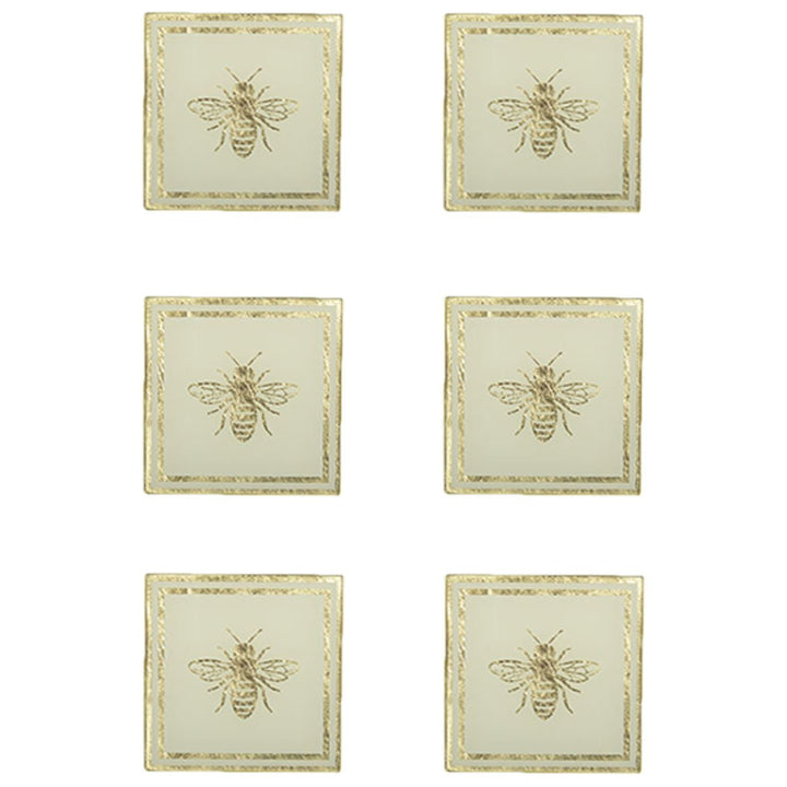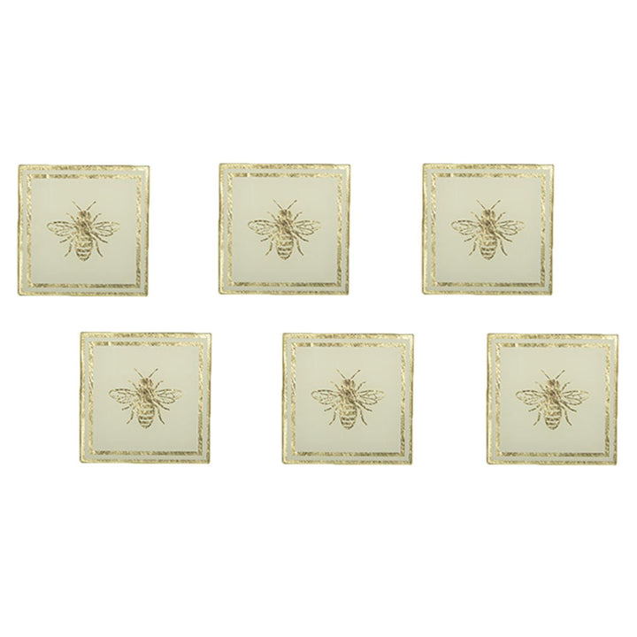 Set van 6 onderzetters in bijendesign 9cm, handwas, de gouden details zullen originaliteit aan uw tafel geven Aulica is een Frans merk gespecialiseerd in servies VAATWASSERBESTENDIG: Nee VOEDSELVEILIG: Nee MAGNETRONBESTENDIG: Nee OVENBESTENDIG Nee