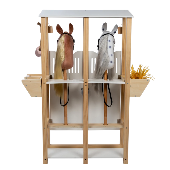 Daarnaast worden er twee kleine krijtborden meegeleverd waar je optioneel de namen van de stokpaardjes op kunt schrijven. De borden kunnen worden opgehangen aan kleine houten knoppen boven de staldeuren. Andere knoppen aan de zijkant van de stal kunnen worden gebruikt om andere accessoires op te hangen, zoals hoofdstellen, halsters, linten en andere rij-uitrusting.