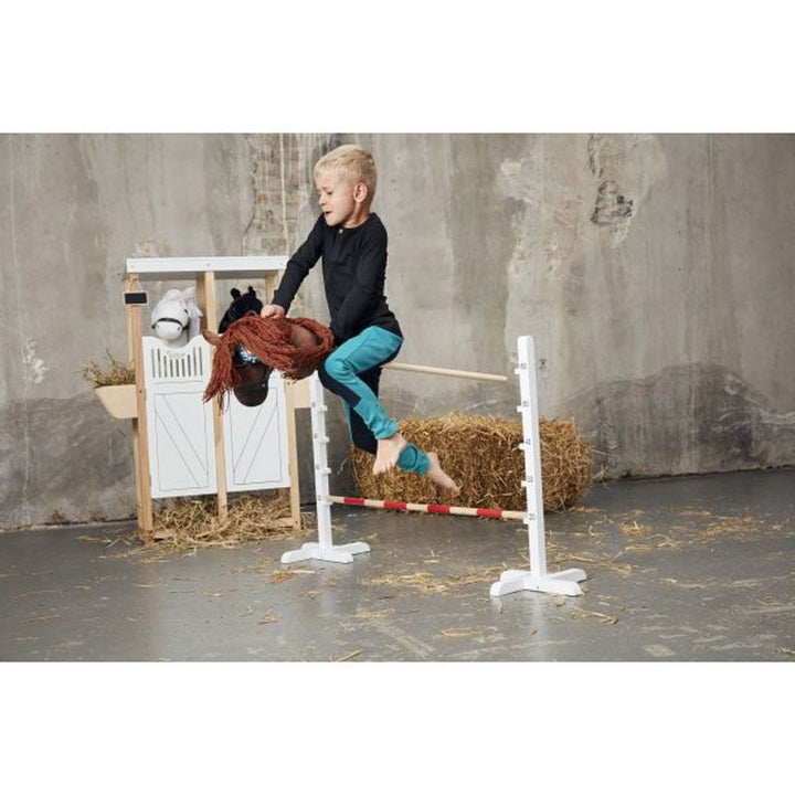 De houten stok van het stokpaardje is nu 40 cm lang, dus de totale hoogte van het paard is 68 cm. De kortere stok kan een voordeel zijn bij het springen over obstakels.