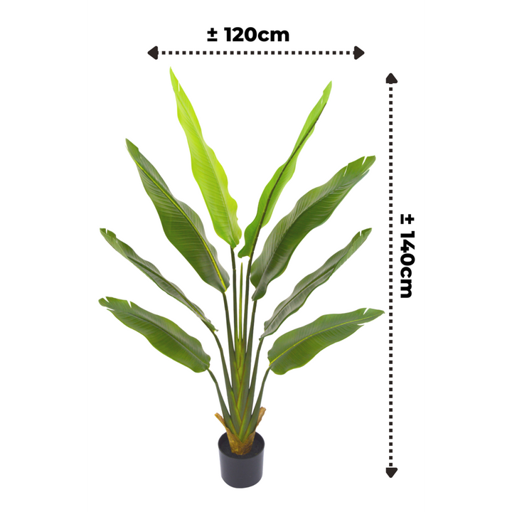 Voordelen van een Strelitzia kunstplant ✅ Onze kunstplanten gaan nooit dood✅ Onze kunstplanten zijn hypoallergeen✅ Onze kunstplanten vorm je eenvoudig naar wens✅ Onze kunstplanten blijven altijd de gewenste afmeting✅ Onze kunstplanten hebben geen verzorging nodig en kunnen overal staan Afmetingen Strelitzia kunstplant 140cm Hoogte kunstplant: 140cmDiameter kunstplant: 120cmHoogte pot: 13cmDiameter pot: 15cmKijk deze Strelitzia kunstplant eens stralen! Met zijn mooie middelgrote formaat een ideale kunstplant voor bijna iedere ruimte. Weet jij al welke ruimte je een tropische touch gaat geven? Bloempotje erbij? Deze Strelitzia kunstplant wordt standaard geleverd met een zwarte “kweekpot”. Op zoek naar een mooiere partner voor je Strelitzia?Bekijk dan hier al onze bloempottenToch liever een andere Strelitzia? Die vind je hier