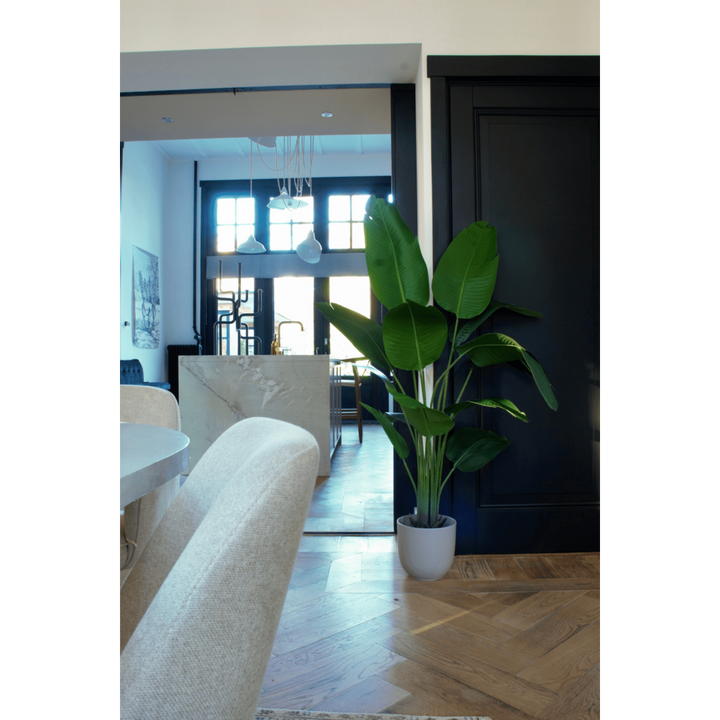 Voordelen van een Strelitzia kunstplant ✅ Onze kunstplanten gaan nooit dood✅ Onze kunstplanten zijn hypoallergeen✅ Onze kunstplanten vorm je eenvoudig naar wens✅ Onze kunstplanten blijven altijd de gewenste afmeting✅ Onze kunstplanten hebben geen verzorging nodig en kunnen overal staan Afmetingen Strelitzia kunstplant 160cm Hoogte kunstplant: 160cmDiameter kunstplant: 110cmHoogte pot: 13cmDiameter pot: 15cm Deze Strelitzia is met haar 1.6 m een flinke verschijning. Normaal gesproken is de Strelitzia gek op zonneschijn, maar deze prachtige kunstplant kan je gerust in plekje in de schaduw geven. Heb jij al een mooie plek in gedachten? Bloempotje erbij? Deze Strelitzia kunstplant wordt standaard geleverd met een zwarte “kweekpot”. Op zoek naar een mooiere partner voor je Strelitzia?Bekijk dan hier al onze bloempottenToch liever een andere Strelitzia? Die vind je hier