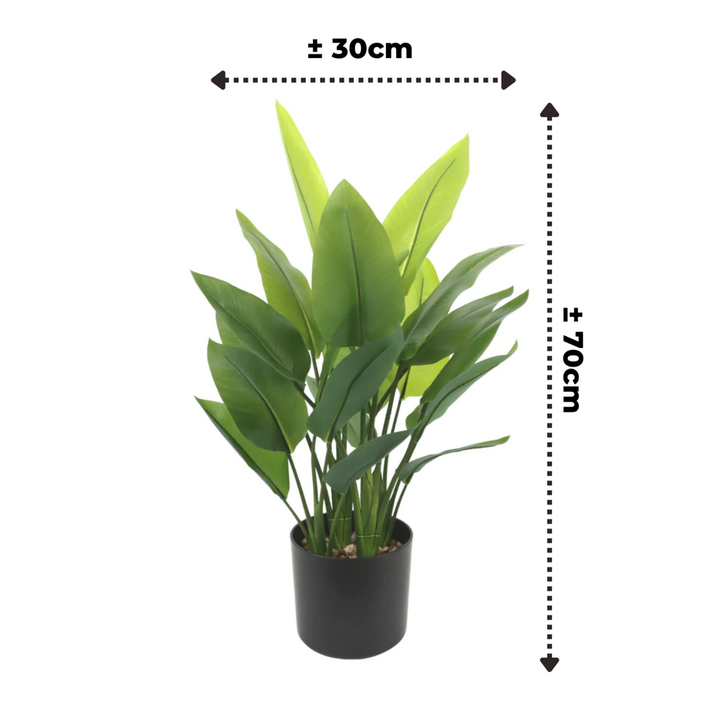 Voordelen van een Strelitzia kunstplant ✅ Onze kunstplanten gaan nooit dood✅ Onze kunstplanten zijn hypoallergeen✅ Onze kunstplanten vorm je eenvoudig naar wens✅ Onze kunstplanten blijven altijd de gewenste afmeting✅ Onze kunstplanten hebben geen verzorging nodig en kunnen overal staan Afmetingen Strelitzia kunstplant 70cm Hoogte kunstplant: 70cmDiameter kunstplant: 40cmHoogte pot: 14,6cmDiameter pot: 17cm Wie wil er nou niet zo'n heerlijke tropische sfeer in huis halen? Deze Strelitzia kunstplant kan je dankzij zijn mooie lengte, zowel op een kast als op de grond laten shinen. De plant heeft 6 mooie grote bladeren die je zelf mooi kan vormen hoe jij ze het liefste ziet, ideaal toch? Bloempotje erbij? Deze Strelitzia kunstplant wordt standaard geleverd met een zwarte “kweekpot”. Op zoek naar een mooiere partner voor je Strelitzia?Bekijk dan hier al onze bloempottenToch liever een andere Strelitzia? Die vind je hier
