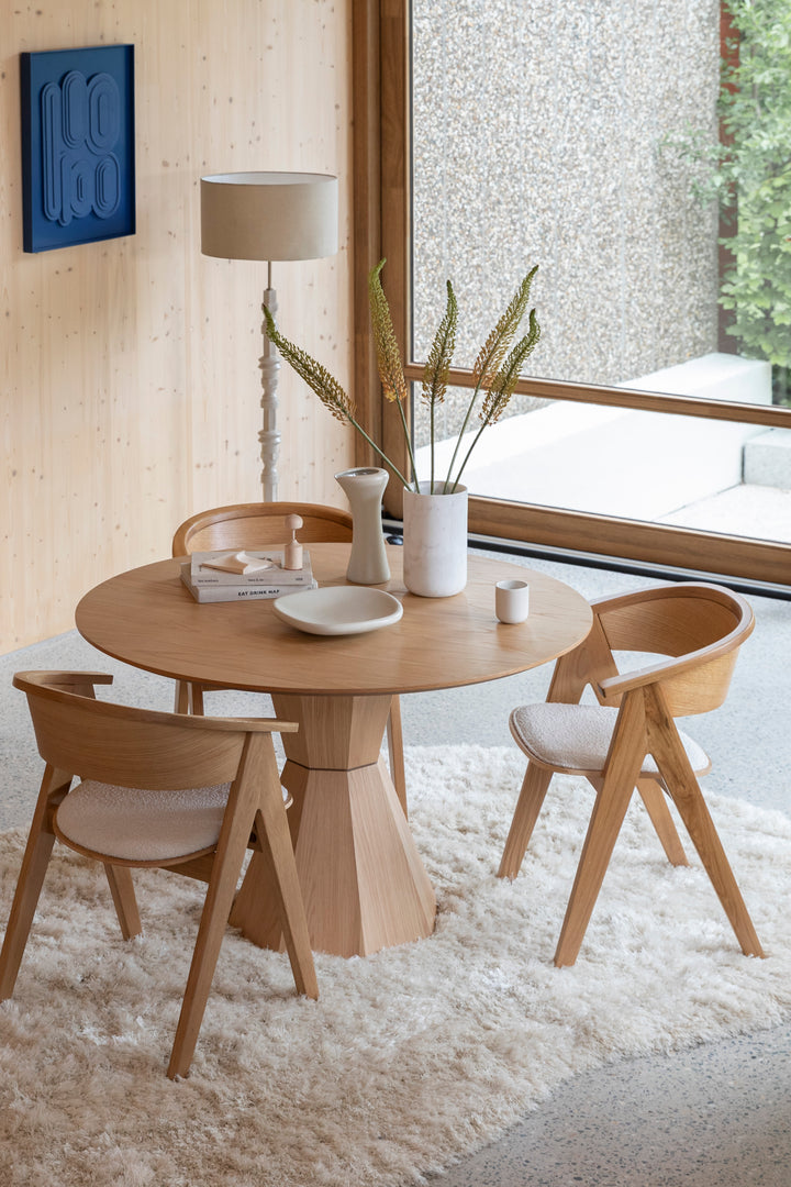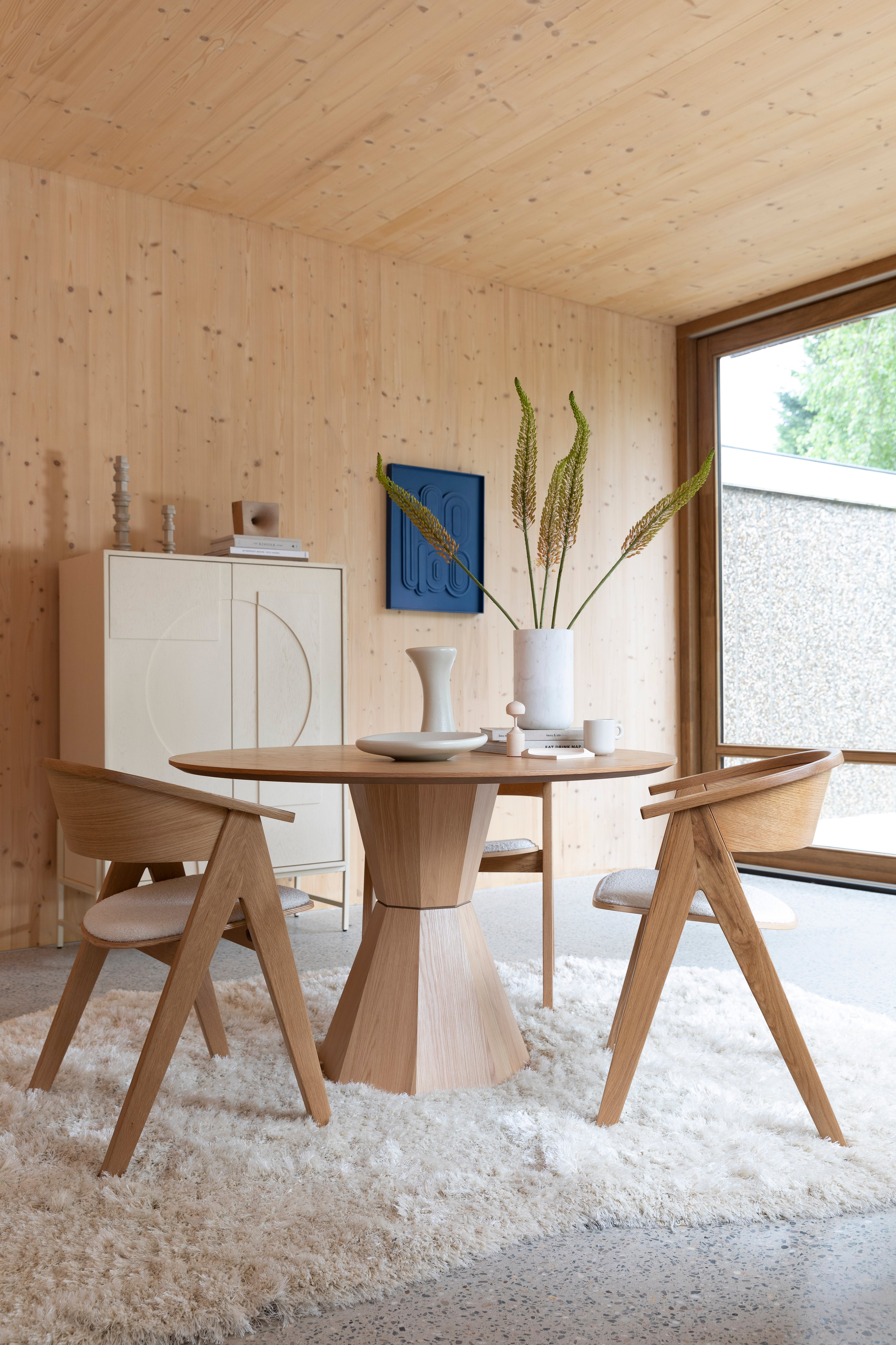 - Een hoekige tafelpoot met strakke lijnen vormt het perfecte contrast met het ronde tafelblad.
