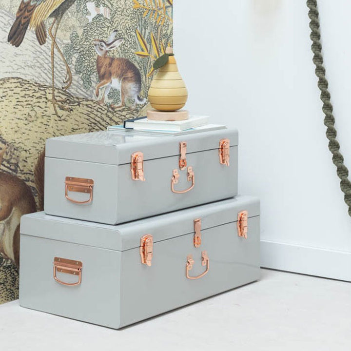 Set van twee Trunks in Elegant Grey.Prachtige metalen trunks, gemaakt van gegalvaniseerd ijzer en een poedercoat finish.Onze koffers worden met de hand afgewerkt en behouden zo de karakteristieke uitstraling die je bij deze koffers mag verwachten. Maten:Small Trunk 52cm x 26cm x 20cmLarge Trunk 60cm x 36cm x 24cm