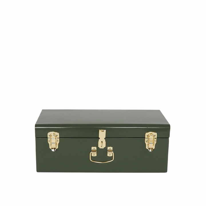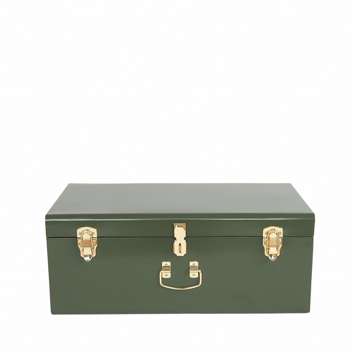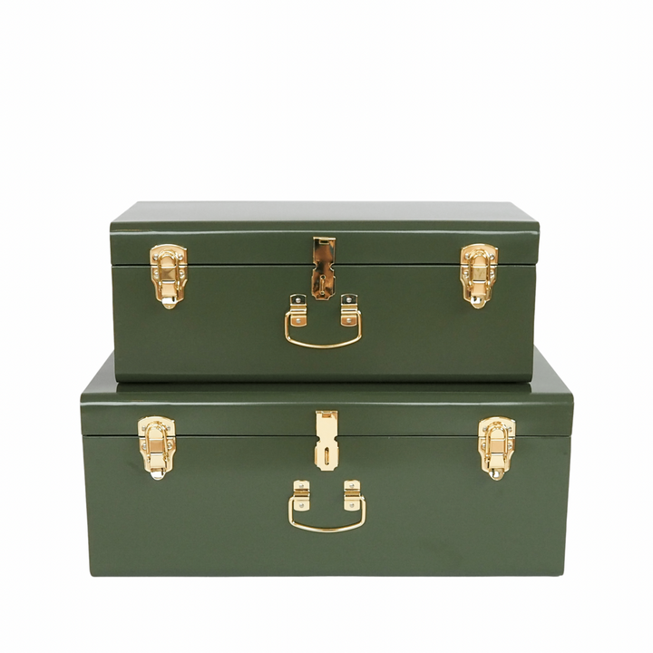 Set van twee Trunks in Safari Green. Prachtige metalen trunks, gemaakt van gegalvaniseerd ijzer en een poedercoat finish. Onze koffers worden met de hand afgewerkt en behouden zo de karakteristieke uitstraling die je bij deze koffers mag verwachten.