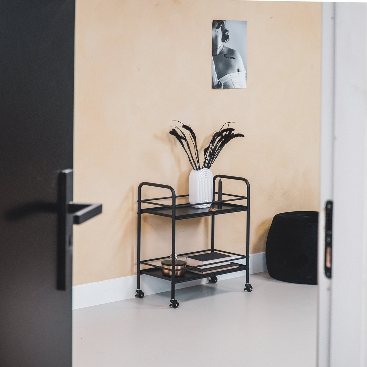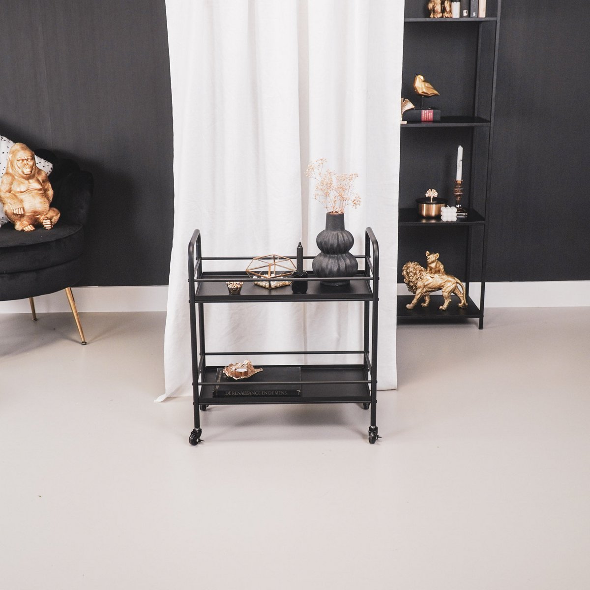 TROLLEYTIJD! Deze trolley is zo elegant en handig. Gebruik de barwagen op wielen als stylingobject of als bijzettafel: hij past allebei. Belangrijke kenmerken: - Gemaakt van metaal - 2 lagen - Afmeting: 60x30x66,5cm - NeergeslagenStylingadvies: Gebruik de zwarte trolley als snacktafel tijdens het bingewatchen of style hem als leestafel.
