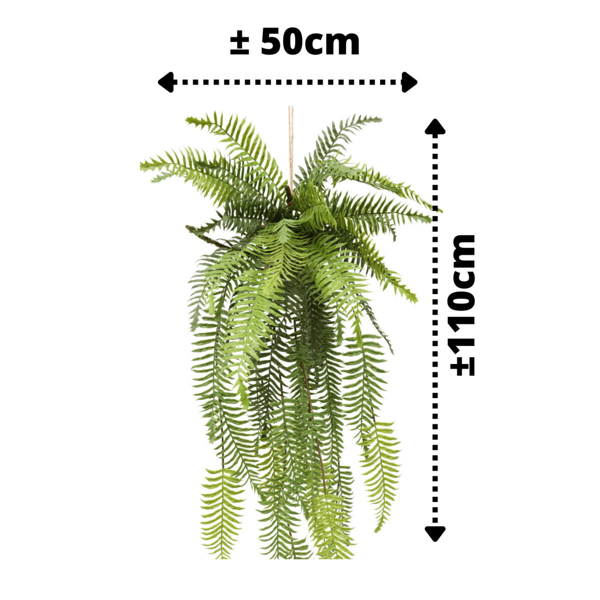 Voordelen van Varen Kunst Hangplant 110cm ✅ Onze kunstplanten gaan nooit dood✅ Onze kunstplanten zijn hypoallergeen✅ Onze kunstplanten vorm je eenvoudig naar wens✅ Onze kunstplanten blijven altijd de gewenste afmeting✅ Onze kunstplanten hebben geen verzorging nodig en kunnen overal staan Afmetingen Varen Kunst Hangplant 110cm Hoogte kunstplant: 110cmDiameter kunstplant: 30cmHoogte pot: 12,5cmDiameter pot: 15cm Op zoek naar een hele mooie varen kunst hangplant? Zoek dan niet verder. Dit is een hele volle kunst hangplant. Perfect om de leegte in een ruimte op te vullen. Met zijn lengte van maar liefst 110cm valt hij in ieder geval op. Heb jij een mooie plek voor deze kunst hangplant in gedachten? Bloempotje erbij? Deze kunst varen wordt standaard geleverd met een zwarte “kweekpot”. Op zoek naar een mooie partner voor je kunstplant? Bekijk dan hier al onze bloempotten